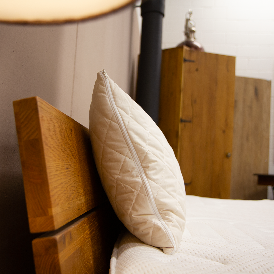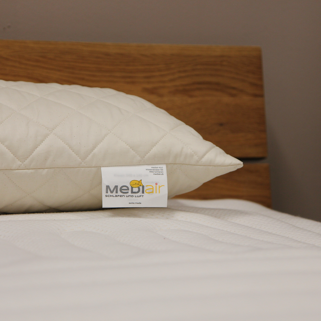 Die handgefertigte Aussenhülle aus naturbelassener Baumwolle ist mit 200 g/m² Baumwolle gefüllt und karoversteppt – für ein angenehm trockenes Schlafklima und stabile Form. Im Inneren sorgt eine abgestimmte Kombination aus elastischen Luftzellstäbchen und formbaren Schafwollkügelchen aus Schweizer Schurwolle für perfekte Balance zwischen Stützkraft und Anpassungsfähigkeit.
