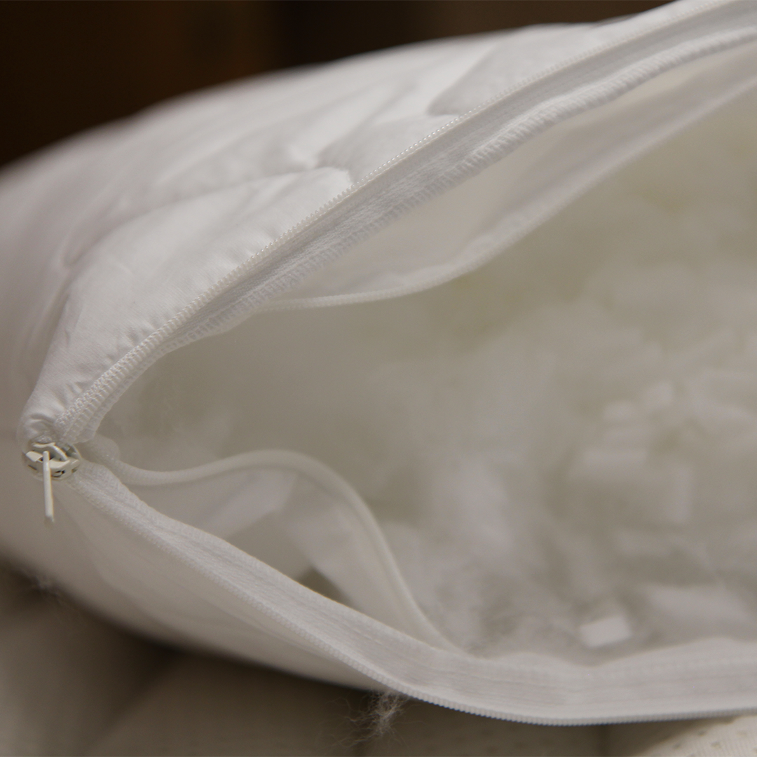 Im Inneren unterstützt eine innovative Füllung aus synthetischen Daunen und elastischen Luftzellstäbchen die ergonomische Lagerung von Kopf und Nacken. Der Oberstoff der Innenhülle aus Baumwolle und Tencel reguliert Feuchtigkeit besonders effektiv und bietet ein angenehmes Hautgefühl – ideal für anspruchsvolle Schläferinnen und Schläfer.